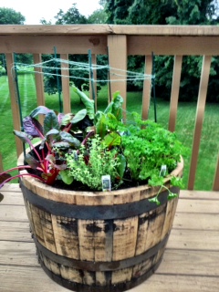 Fast forward to 2013. As a sixty-something ,I have finally discovered the joys of growing my own vegetables in two whiskey barrels on my deck. They are planted with Swiss Chard, herbs (Basil, Sage, Parsely), tomatoes (with a cage), bush beans, and onions. There are also a few marigolds and sunflowers.